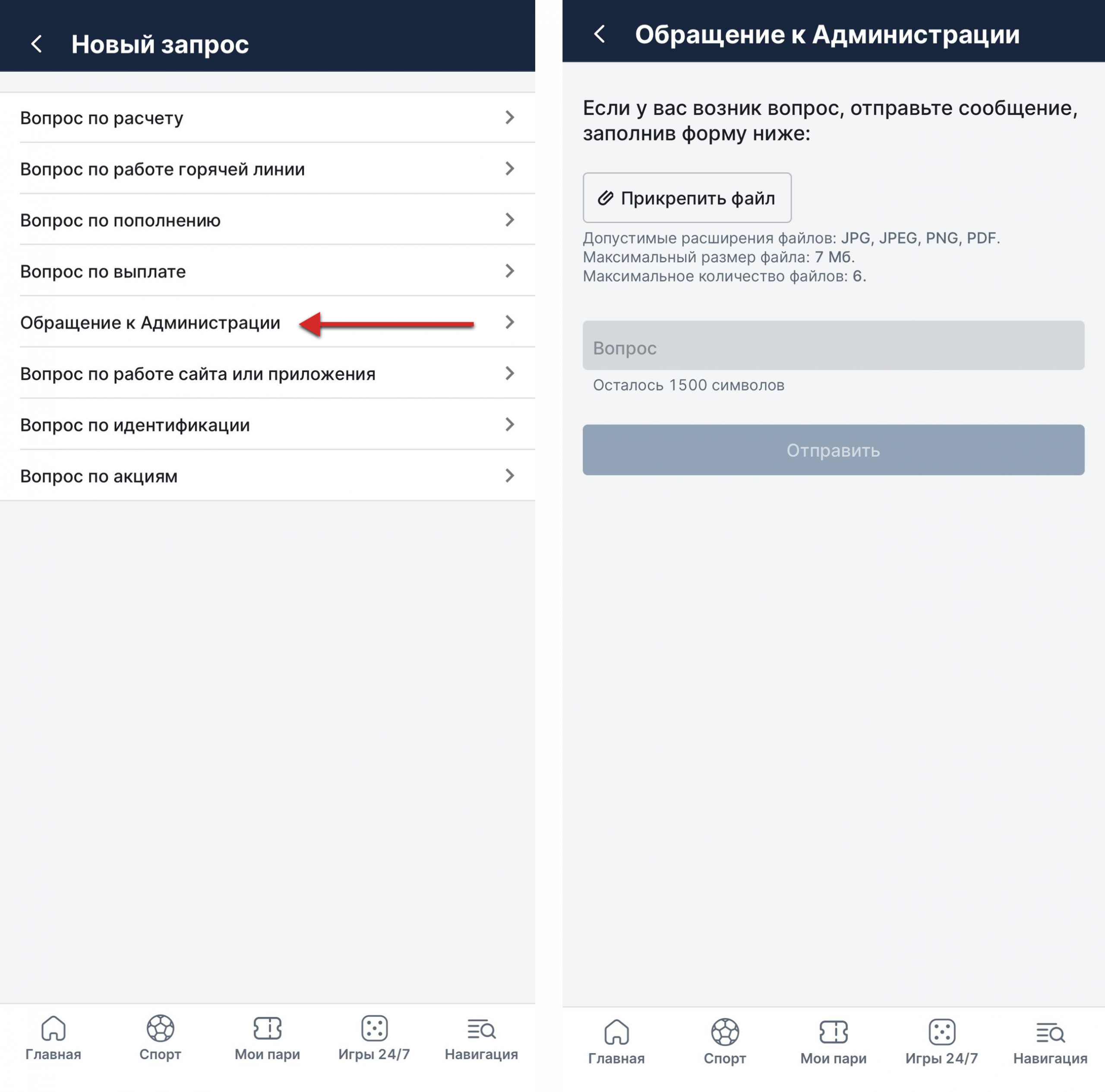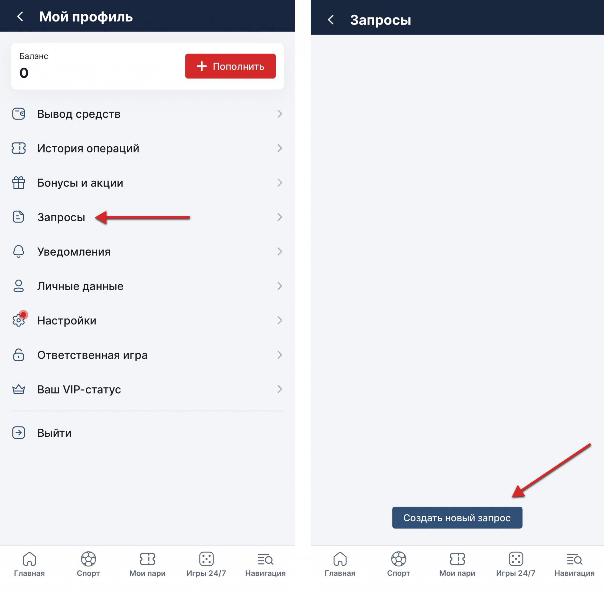 - Перейдите в раздел «Профиль» → «Запросы» (или «Обращения» — название может немного отличаться в зависимости от версии интерфейса).