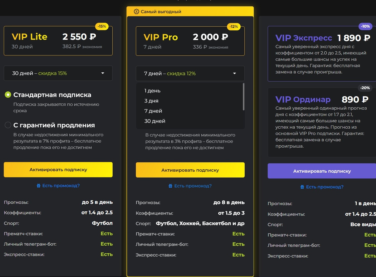 30 дней: стандарт ~2550 ₽ | с гарантией продления (прибыль <7%) ~3050 ₽ - VIP PRO — до 8 ставок/день на футбол + хоккей + баскетбол + другие, кэф 1.5–3.0