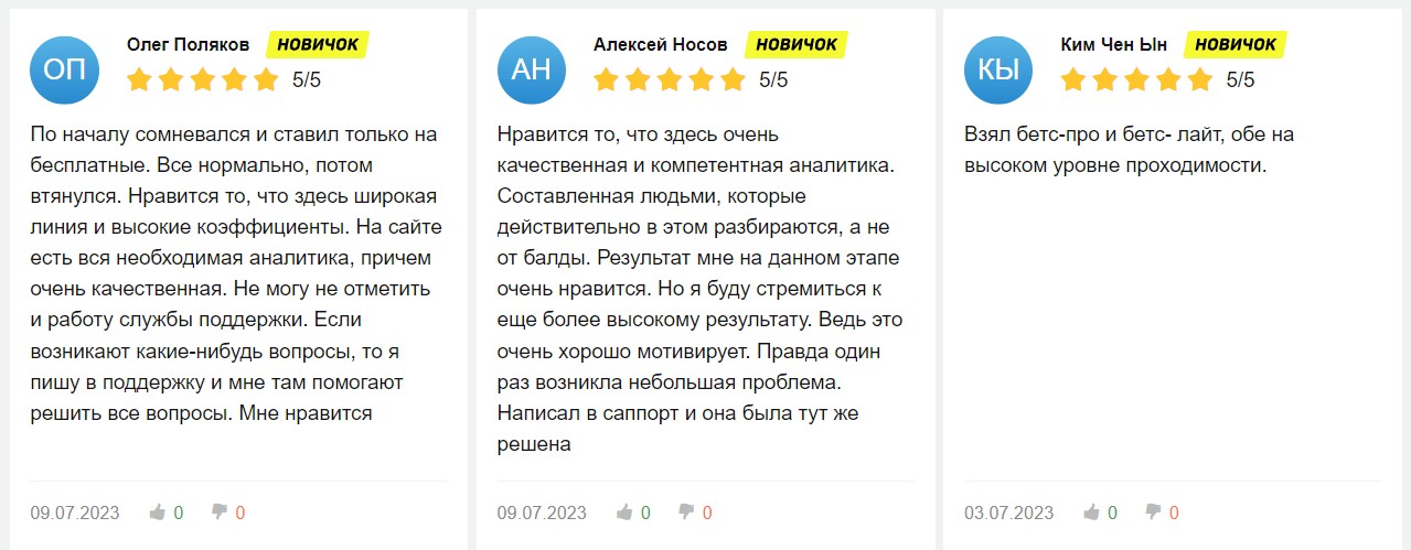 На сайте — положительные комментарии от клиентов. На независимых ресурсах мнения в основном хорошие: хвалят честную статистику, бесплатные ставки, гарантию продления, стабильность и то, что проект в белых списках (95%+ положительных обзоров).