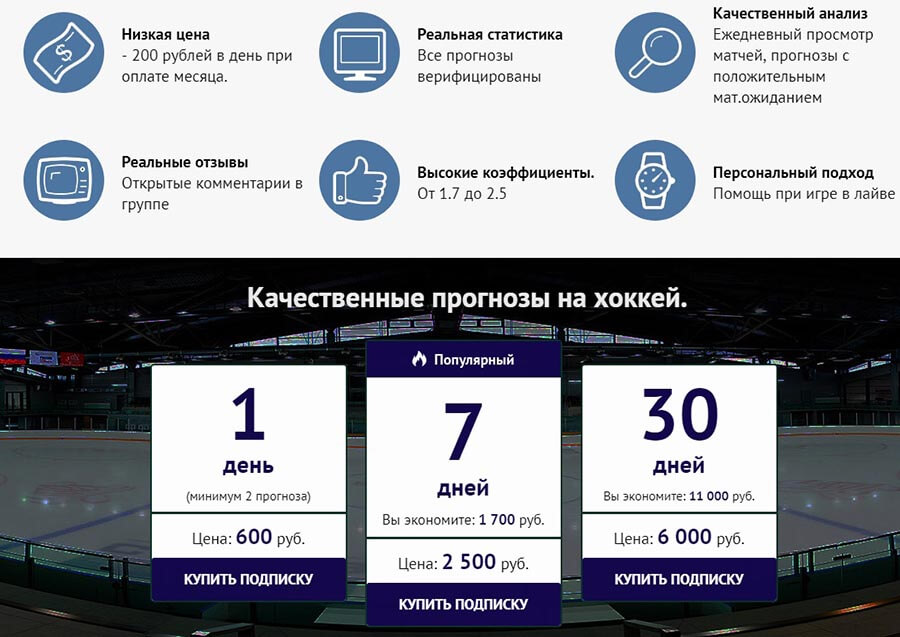 Цены остаются одними из самых доступных среди качественных хоккейных капперов — подходят даже для среднего/маленького банка.