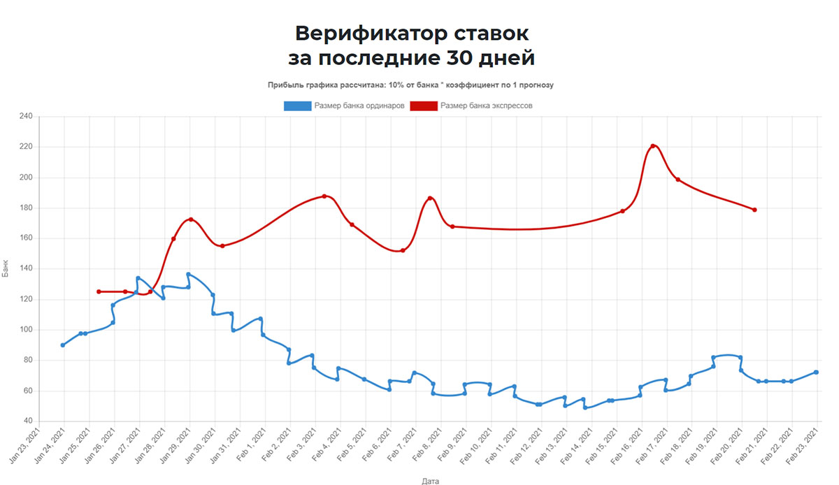 На сайте stavki.club есть график роста/падения банка (за 30 дней, фиксированная ставка 10% от банка) — видно всё в динамике.